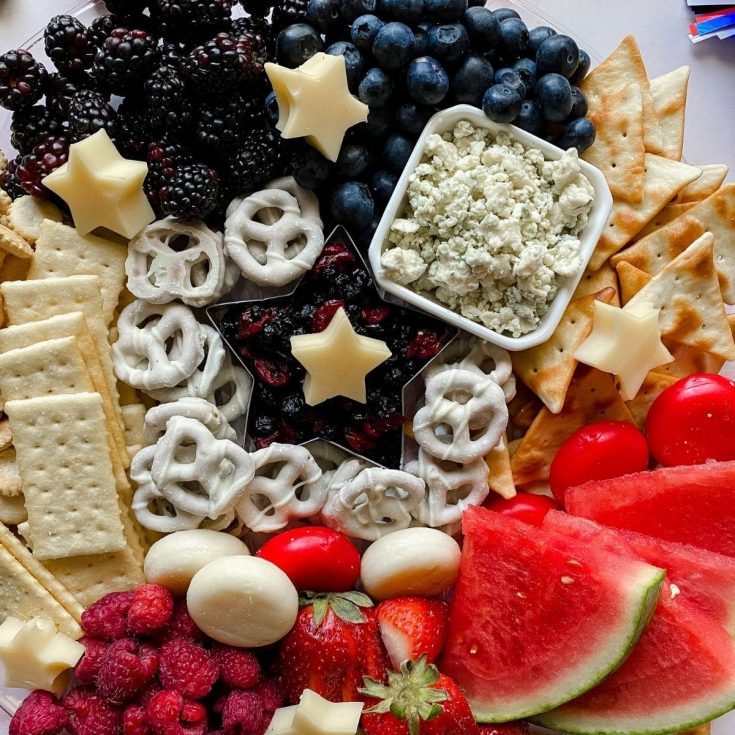 Assemble a sweet and savory patriotic charcuterie board for a fun filled snack for holiday parties or summer barbecues!