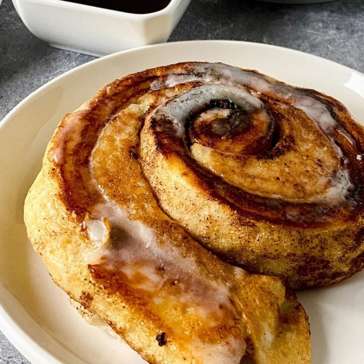 Copycat cinnamon roll pancakes are a delicious semi-homemade breakfast that is similar to the popular Cheesecake Factory pancake with half the work needed!