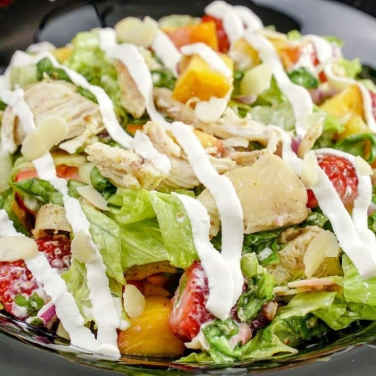 A delicious honey mustard chicken salad is the perfect lunchtime treat! Packed with flavor from strawberries, peaches, almonds, and a bit of goat cheese, it is sure to be a favorite!