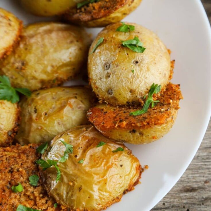 This easy recipe for crispy Parmesan garlic roasted baby potatoes is going to become a family favorite potato side dish!