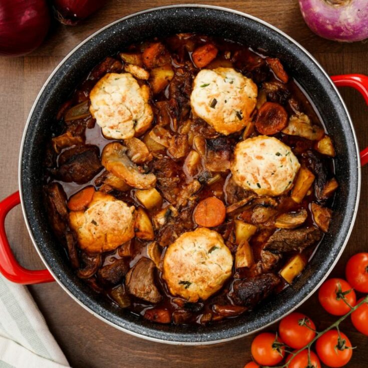 This classic beef Guinness stew recipe is delicious! Topped with homemade cheddar herb dumplings, it's the ideal comfort food meal!